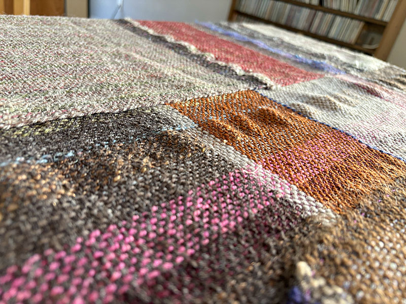 I’ve been accumulating a collection of 3-yard strips woven on a rigid heddle loom. The yarns are all handspun wool and wool blends, plied, from a stash that goes back over 50 years. Spinners will recognize that wool yarns have widely differing takeup and shrinkage properties depending on breed of the sheep, amount of twist, yarn size, etc. Well, here’s a perfect demostration, laid out on my worktable.