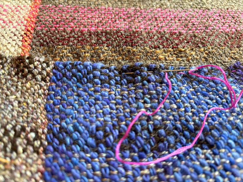 I have chosen the latter. I lap the selvedges and handstitch them with embroidery floss, in a running stitch. I let the selvedges meander as they will.
