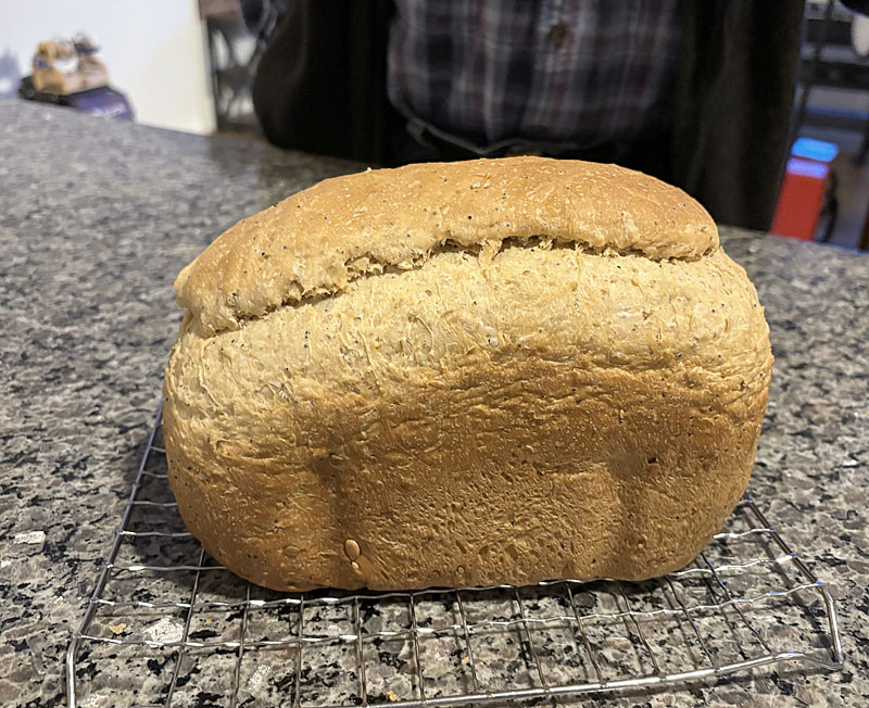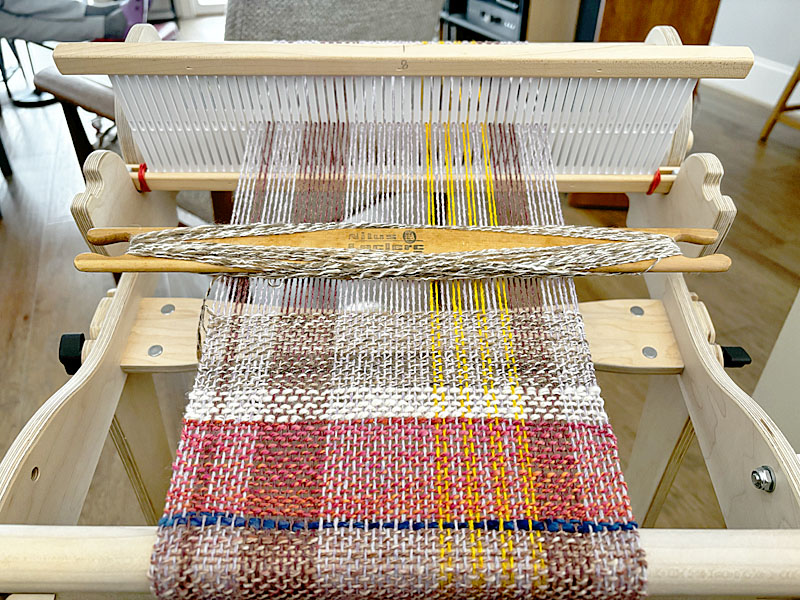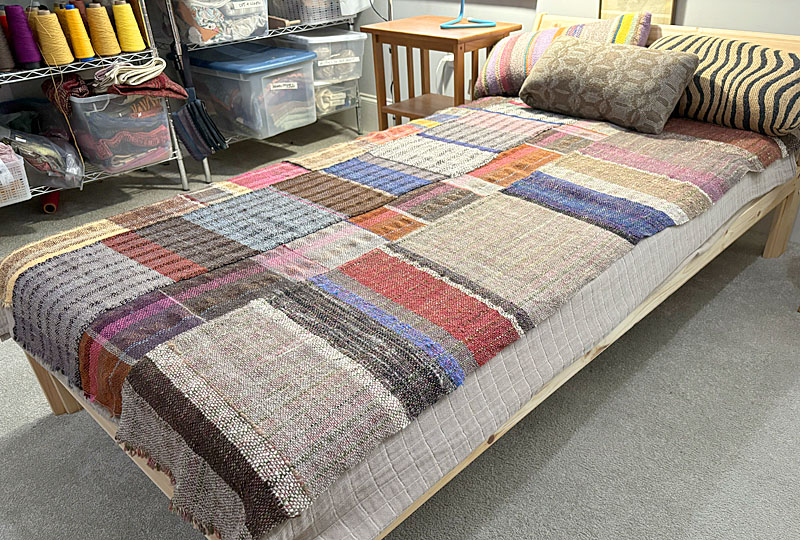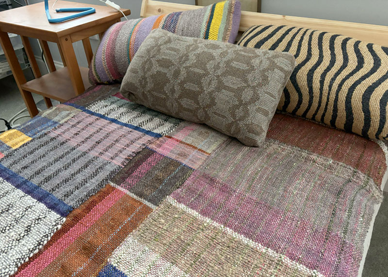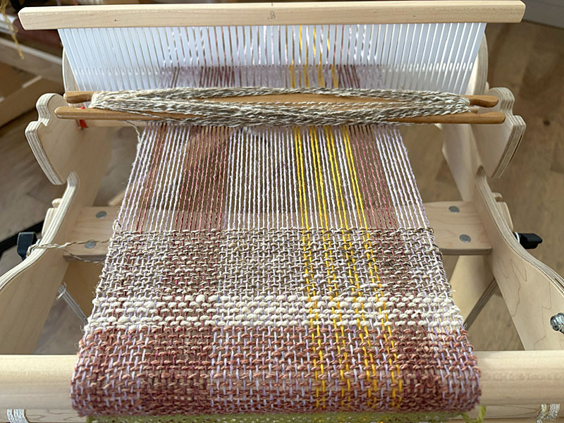 The blanket you saw here is being added to, gradually. It needed to be wider, so I’m adding two more strips, one on each side. Although the first four strips were all handspun warp and weft, for these additional strips I’m using Harrisville Shetland wool from my stash as warp, and handspun wool as weft. Here is strip #1 still on the loom: