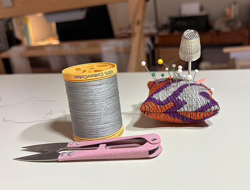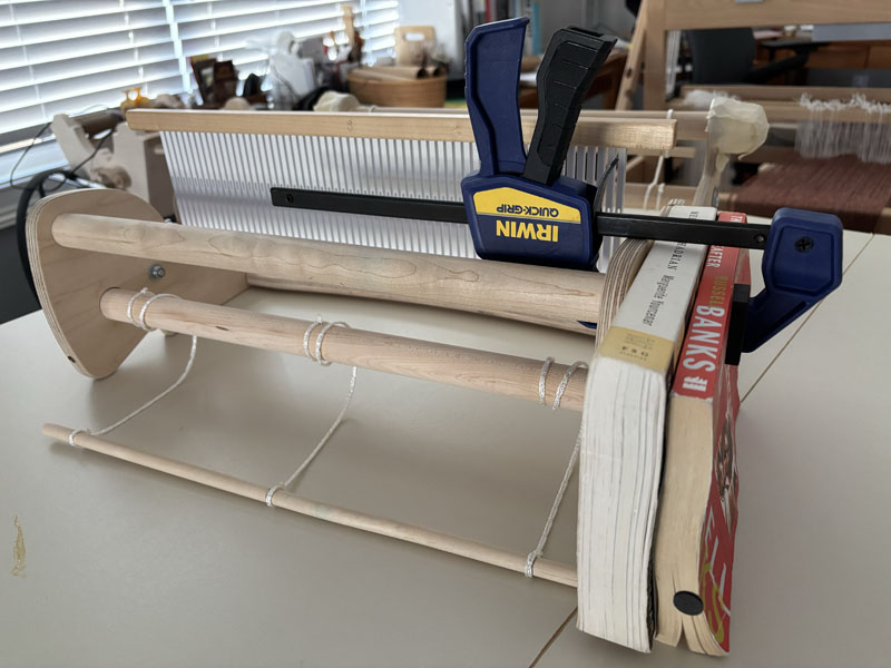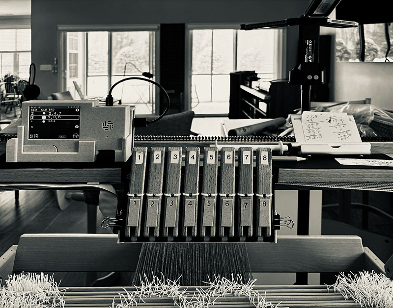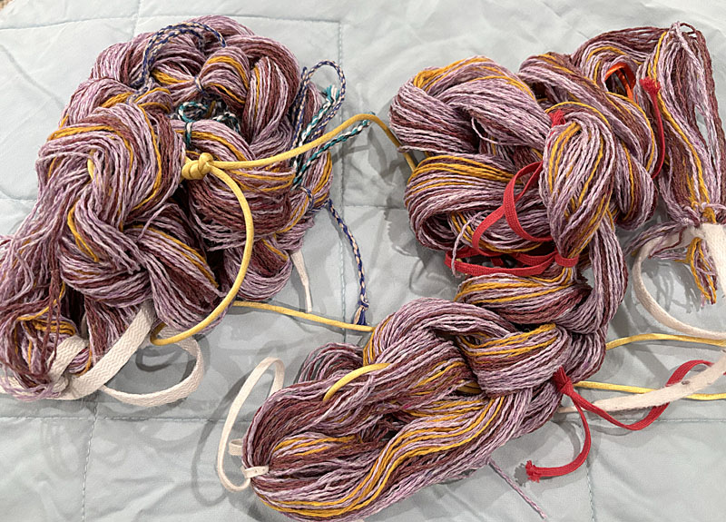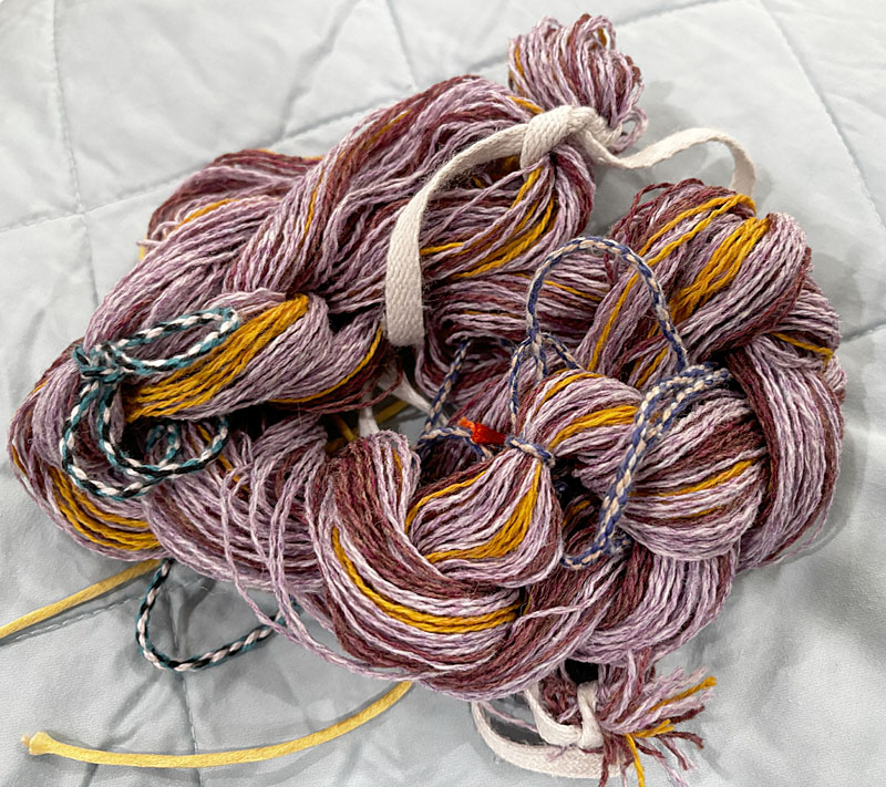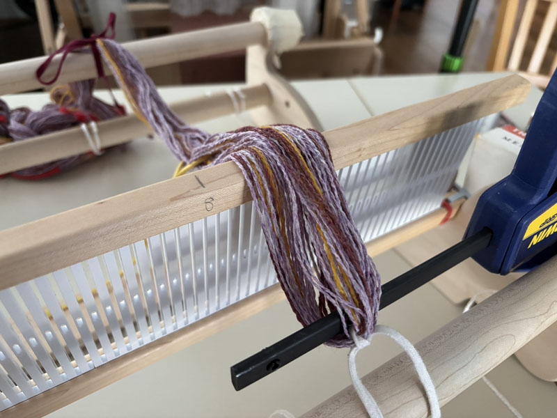The warp for the final strip, ready to go on the loom. Same Shetland wool, but in a different strip arrangement.