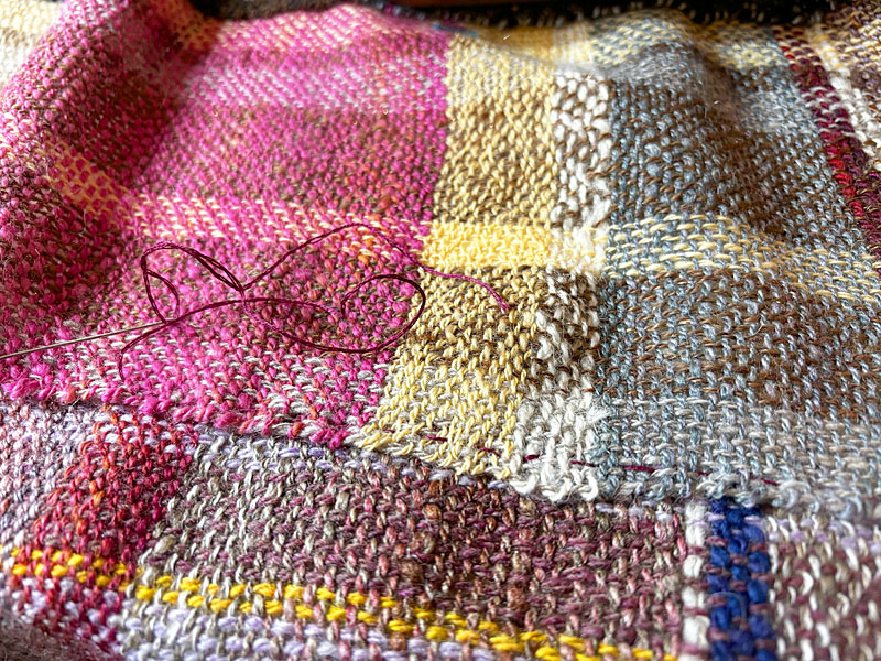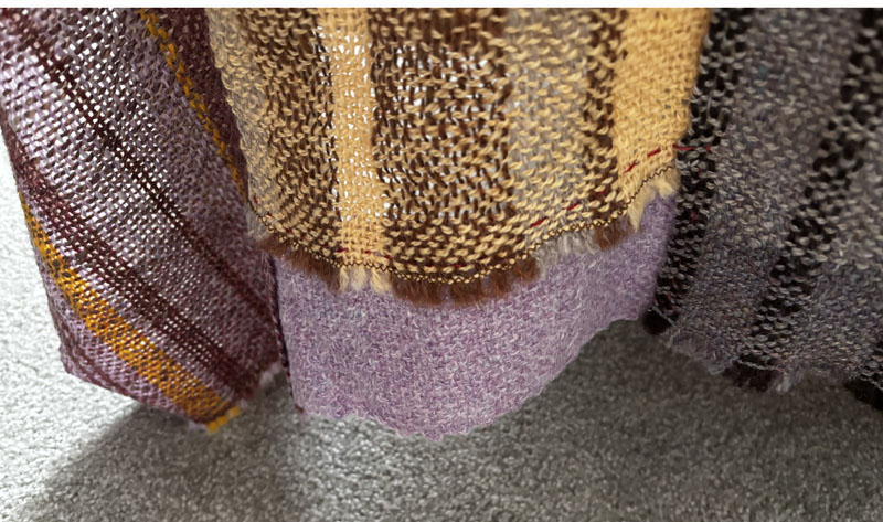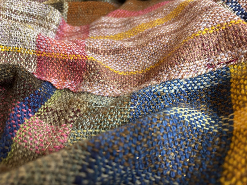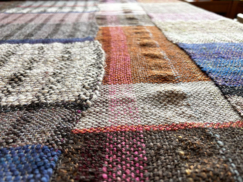And a low angle shot of the eccentric edges in all their sassy behavior. Below you may also note what happens when you combine very differently spun yarns in the same warp: bubbles! Love them or hate them, they’re there to stay.