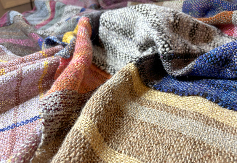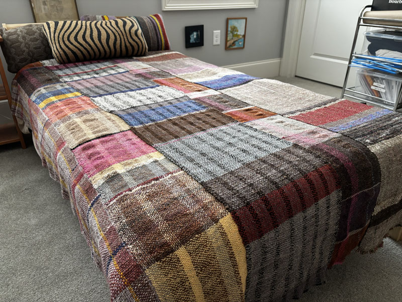 The blanket is finally, finally finished and wants to take one more bow. Six strips total, of different widths, and (mostly) all the same length. About 95% handspun wool and other fibers. 8 epi on rigid heddle looms.