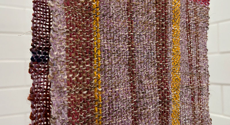In the Department of Yarn, the very final panel of the multi-paneled blanket (in case you’re following along on this one) has finally come off the loom and been washed and fulled. Here it is hanging up in the bathroom. Harrisville shetland warp, handspun weft of various pedigrees. When this one is steam pressed, I expect it to be as fluffy as its sister panels.