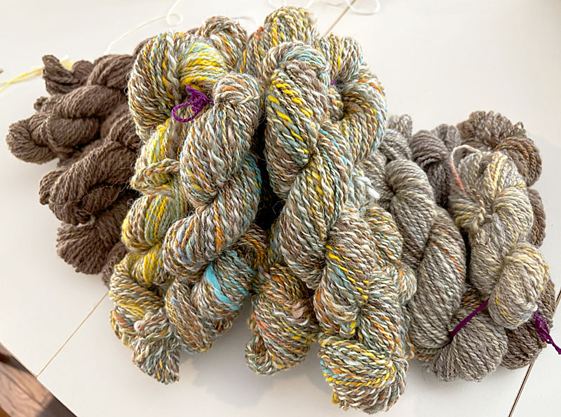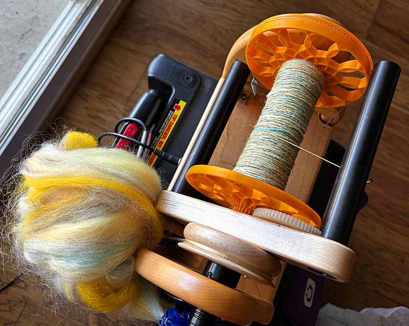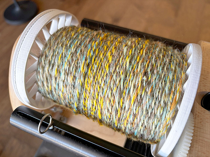 I then spun up the carded fluff into singles yarn on my Hansencrafts miniSpinner. That took several days.